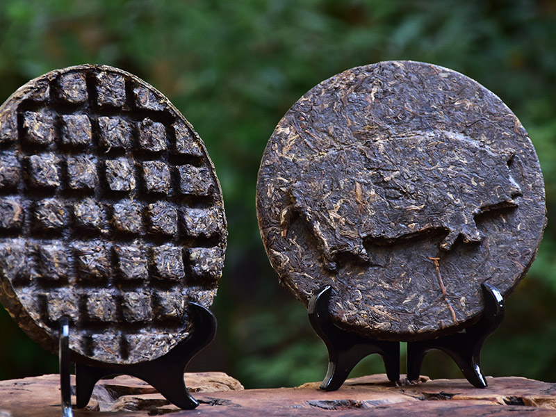 + Hình dáng: Bánh trà ép chặt, mặt ngoài phủ một lớp nhựa (cao) trà, ích cho việc bảo quản, chống khí hậu nồm ẩm, chống mốc, trà lên men ổn định trong mọi điều kiện thời tiết. Màu xanh trong cánh trà ép bánh sẽ ngả thẫm dần theo thời gian.