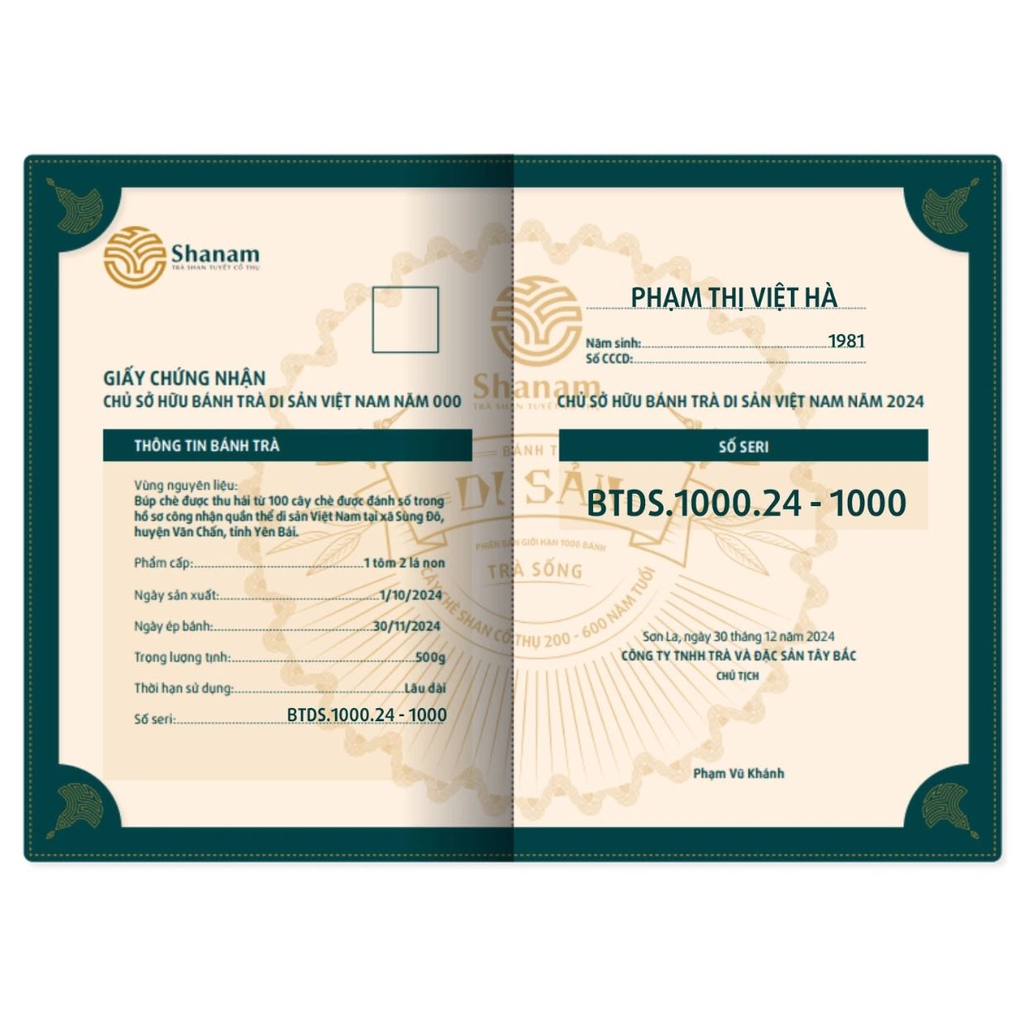 Bánh trà Di sản Việt Nam năm 2023 sản xuất số lượng giới hạn 500 bánh, được đánh mã số từng bánh trà theo thứ tự từ 1 – 500 và có chữ ký trực tiếp của người sáng lập thương hiệu trà Shanam Phạm Vũ Khánh trên từng bánh trà. Mỗi bánh trà có QR riêng truy suất về website www.shanam.com.vn chứng minh chủ sở hữu của bánh trà.