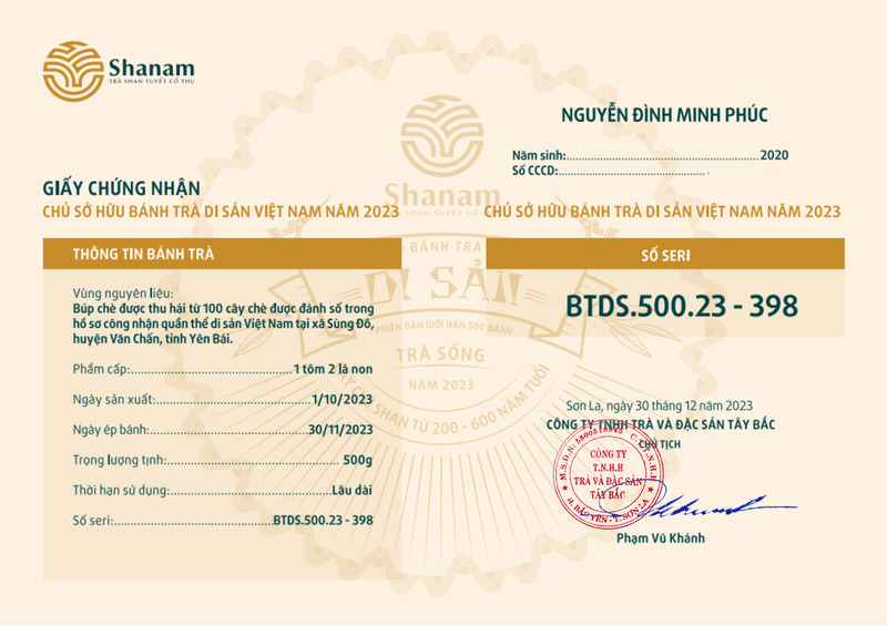 Bánh trà Di sản Việt Nam năm 2023 sản xuất số lượng giới hạn 500 bánh, được đánh mã số từng bánh trà theo thứ tự từ 1 – 500 và có chữ ký trực tiếp của người sáng lập thương hiệu trà Shanam Phạm Vũ Khánh trên từng bánh trà. Mỗi bánh trà có QR riêng truy suất về website www.shanam.com.vn chứng minh chủ sở hữu của bánh trà.