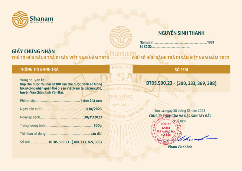 Bánh trà Di sản Việt Nam năm 2023 sản xuất số lượng giới hạn 500 bánh, được đánh mã số từng bánh trà theo thứ tự từ 1 – 500 và có chữ ký trực tiếp của người sáng lập thương hiệu trà Shanam Phạm Vũ Khánh trên từng bánh trà. Mỗi bánh trà có QR riêng truy suất về website www.shanam.com.vn chứng minh chủ sở hữu của bánh trà.