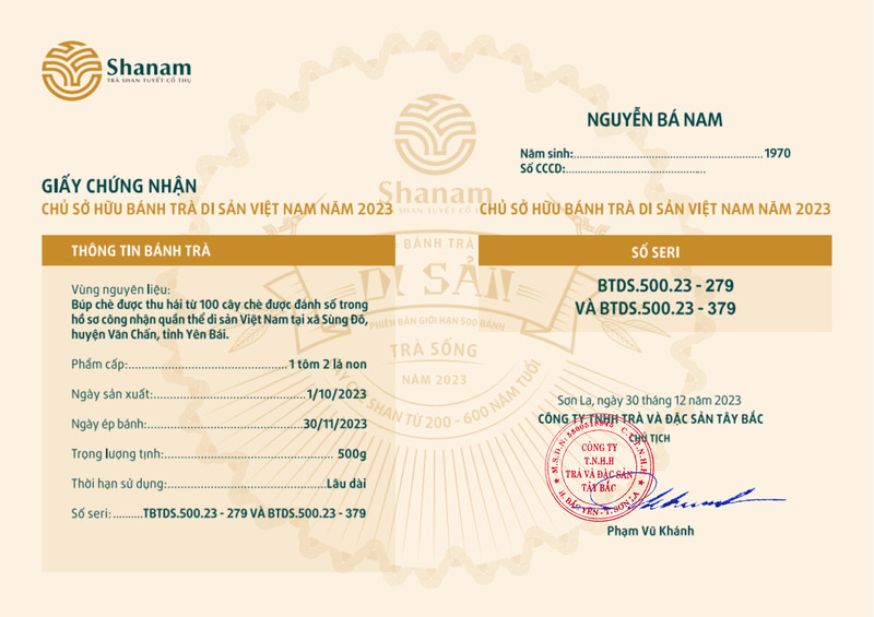 Bánh trà Di sản Việt Nam năm 2023 sản xuất số lượng giới hạn 500 bánh, được đánh mã số từng bánh trà theo thứ tự từ 1 – 500 và có chữ ký trực tiếp của người sáng lập thương hiệu trà Shanam Phạm Vũ Khánh trên từng bánh trà. Mỗi bánh trà có QR riêng truy suất về website www.shanam.com.vn chứng minh chủ sở hữu của bánh trà.