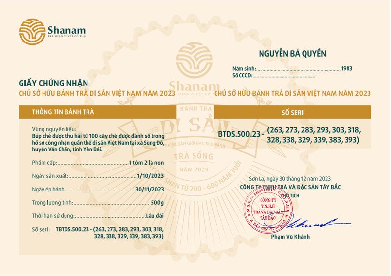 Bánh trà Di sản Việt Nam năm 2023 sản xuất số lượng giới hạn 500 bánh, được đánh mã số từng bánh trà theo thứ tự từ 1 – 500 và có chữ ký trực tiếp của người sáng lập thương hiệu trà Shanam Phạm Vũ Khánh trên từng bánh trà. Mỗi bánh trà có QR riêng truy suất về website www.shanam.com.vn chứng minh chủ sở hữu của bánh trà.