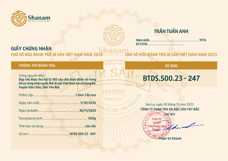 Bánh trà Di sản Việt Nam năm 2023 sản xuất số lượng giới hạn 500 bánh, được đánh mã số từng bánh trà theo thứ tự từ 1 – 500 và có chữ ký trực tiếp của người sáng lập thương hiệu trà Shanam Phạm Vũ Khánh trên từng bánh trà. Mỗi bánh trà có QR riêng truy suất về website www.shanam.com.vn chứng minh chủ sở hữu của bánh trà.