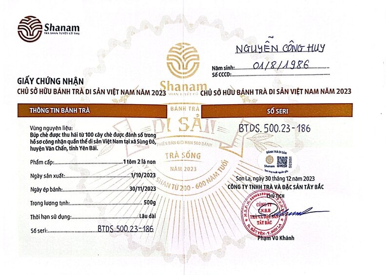 Bánh trà Di sản Việt Nam năm 2023 sản xuất số lượng giới hạn 500 bánh, được đánh mã số từng bánh trà theo thứ tự từ 1 – 500 và có chữ ký trực tiếp của người sáng lập thương hiệu trà Shanam Phạm Vũ Khánh trên từng bánh trà. Mỗi bánh trà có QR riêng truy suất về website www.shanam.com.vn chứng minh chủ sở hữu của bánh trà.