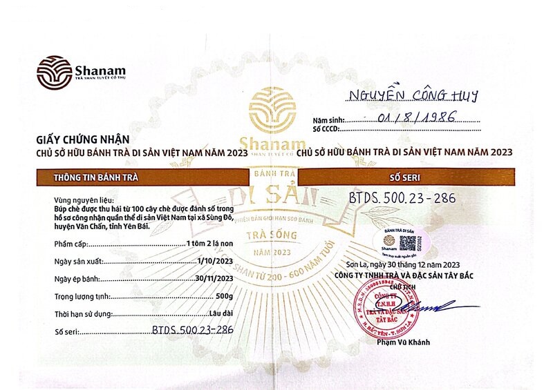Bánh trà Di sản Việt Nam năm 2023 sản xuất số lượng giới hạn 500 bánh, được đánh mã số từng bánh trà theo thứ tự từ 1 – 500 và có chữ ký trực tiếp của người sáng lập thương hiệu trà Shanam Phạm Vũ Khánh trên từng bánh trà. Mỗi bánh trà có QR riêng truy suất về website www.shanam.com.vn chứng minh chủ sở hữu của bánh trà.