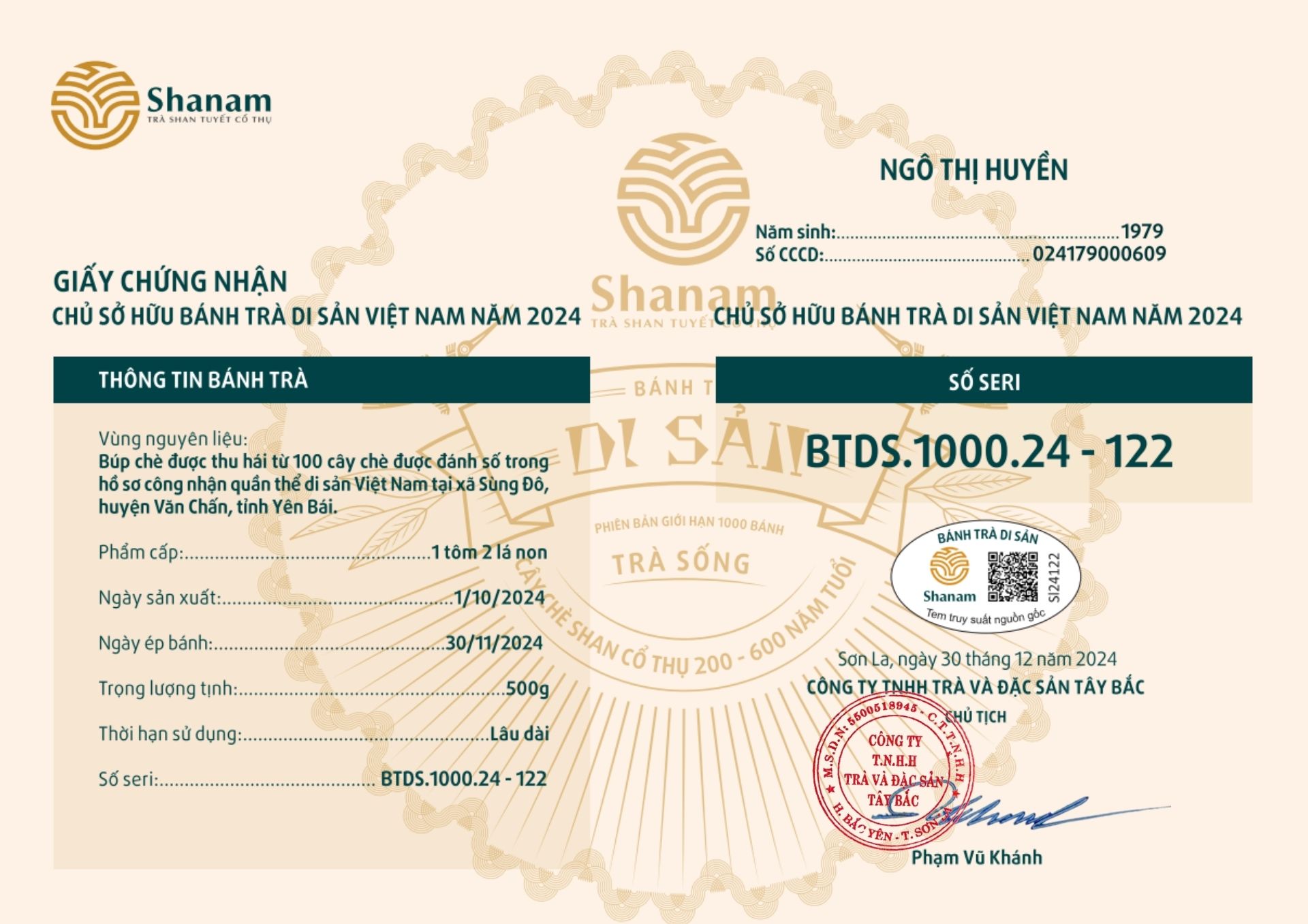 Bánh trà Di sản Việt Nam năm 2023 sản xuất số lượng giới hạn 500 bánh, được đánh mã số từng bánh trà theo thứ tự từ 1 – 500 và có chữ ký trực tiếp của người sáng lập thương hiệu trà Shanam Phạm Vũ Khánh trên từng bánh trà. Mỗi bánh trà có QR riêng truy suất về website www.shanam.com.vn chứng minh chủ sở hữu của bánh trà.