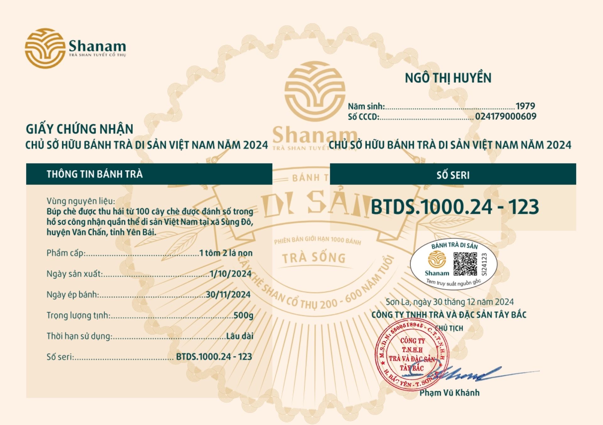 Bánh trà Di sản Việt Nam năm 2023 sản xuất số lượng giới hạn 500 bánh, được đánh mã số từng bánh trà theo thứ tự từ 1 – 500 và có chữ ký trực tiếp của người sáng lập thương hiệu trà Shanam Phạm Vũ Khánh trên từng bánh trà. Mỗi bánh trà có QR riêng truy suất về website www.shanam.com.vn chứng minh chủ sở hữu của bánh trà.