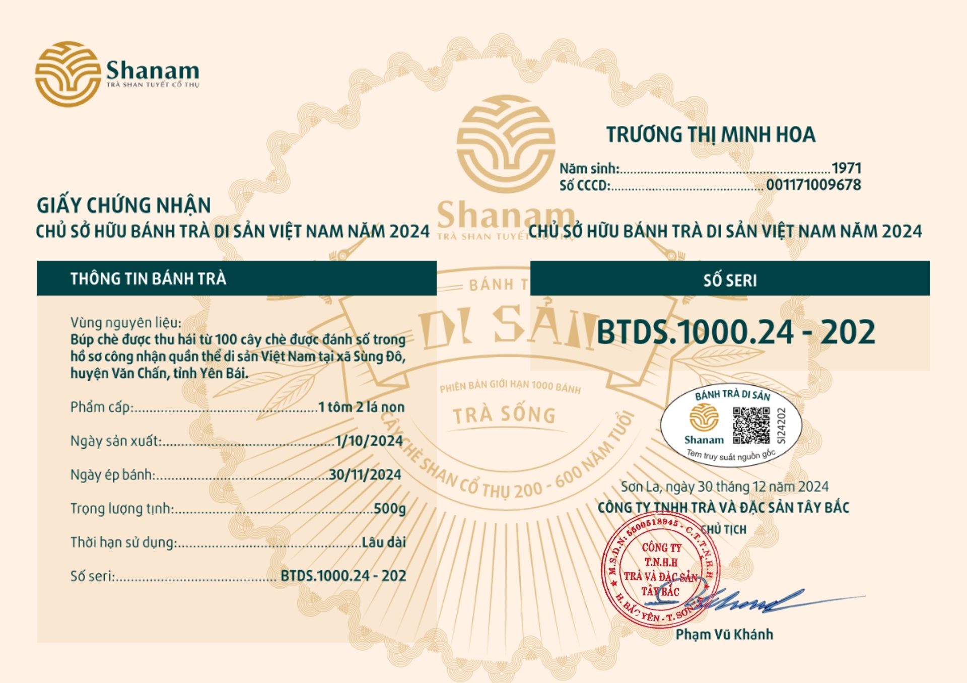 Bánh trà Di sản Việt Nam năm 2023 sản xuất số lượng giới hạn 500 bánh, được đánh mã số từng bánh trà theo thứ tự từ 1 – 500 và có chữ ký trực tiếp của người sáng lập thương hiệu trà Shanam Phạm Vũ Khánh trên từng bánh trà. Mỗi bánh trà có QR riêng truy suất về website www.shanam.com.vn chứng minh chủ sở hữu của bánh trà.
