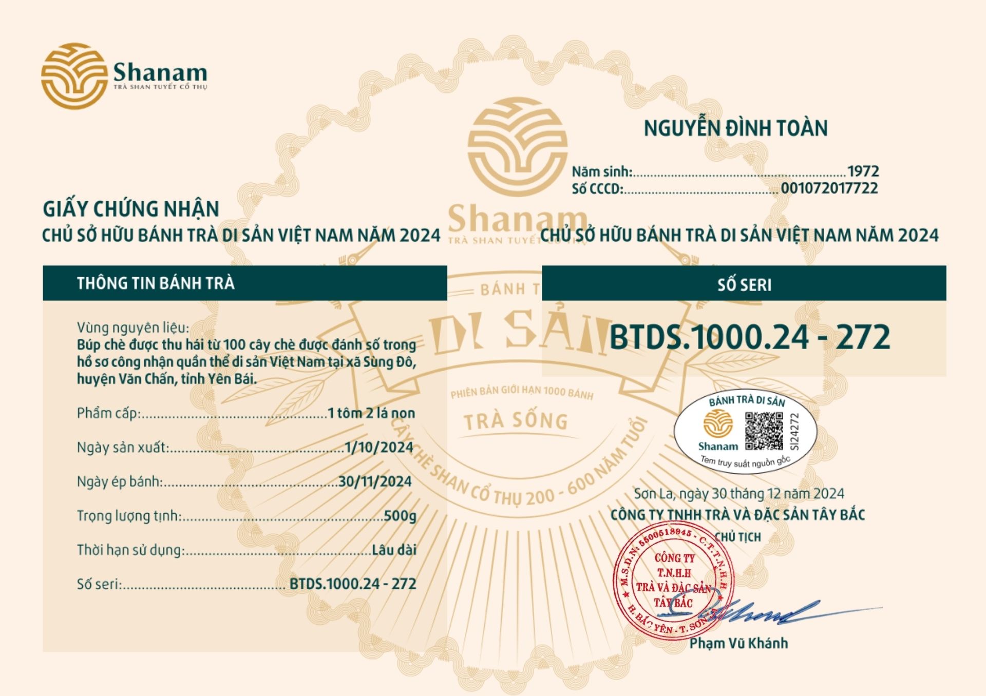 Bánh trà Di sản Việt Nam năm 2023 sản xuất số lượng giới hạn 500 bánh, được đánh mã số từng bánh trà theo thứ tự từ 1 – 500 và có chữ ký trực tiếp của người sáng lập thương hiệu trà Shanam Phạm Vũ Khánh trên từng bánh trà. Mỗi bánh trà có QR riêng truy suất về website www.shanam.com.vn chứng minh chủ sở hữu của bánh trà.