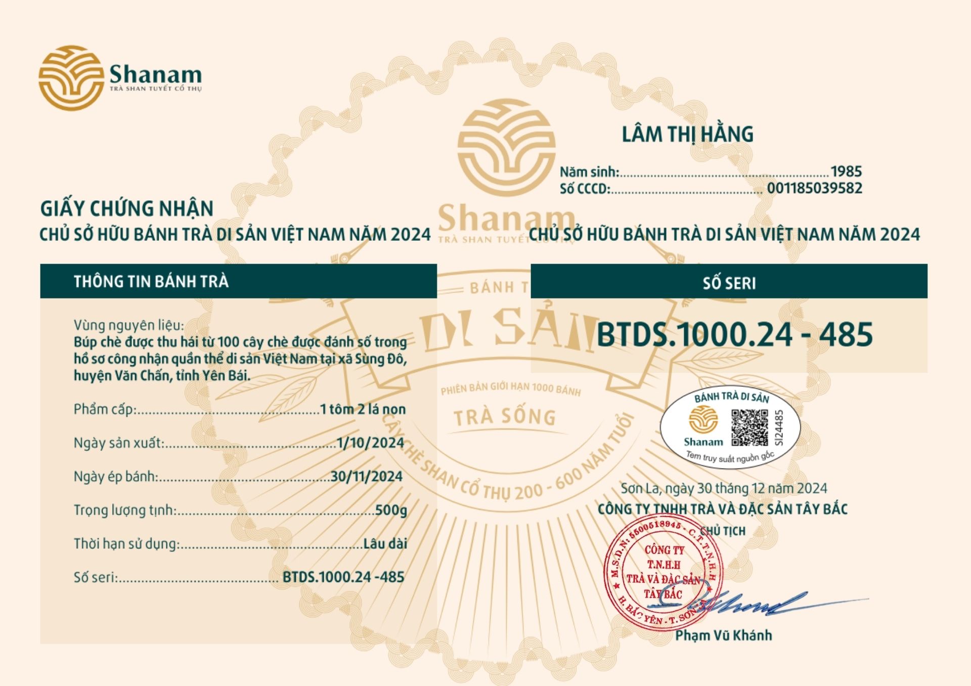 Bánh trà Di sản Việt Nam năm 2023 sản xuất số lượng giới hạn 500 bánh, được đánh mã số từng bánh trà theo thứ tự từ 1 – 500 và có chữ ký trực tiếp của người sáng lập thương hiệu trà Shanam Phạm Vũ Khánh trên từng bánh trà. Mỗi bánh trà có QR riêng truy suất về website www.shanam.com.vn chứng minh chủ sở hữu của bánh trà.