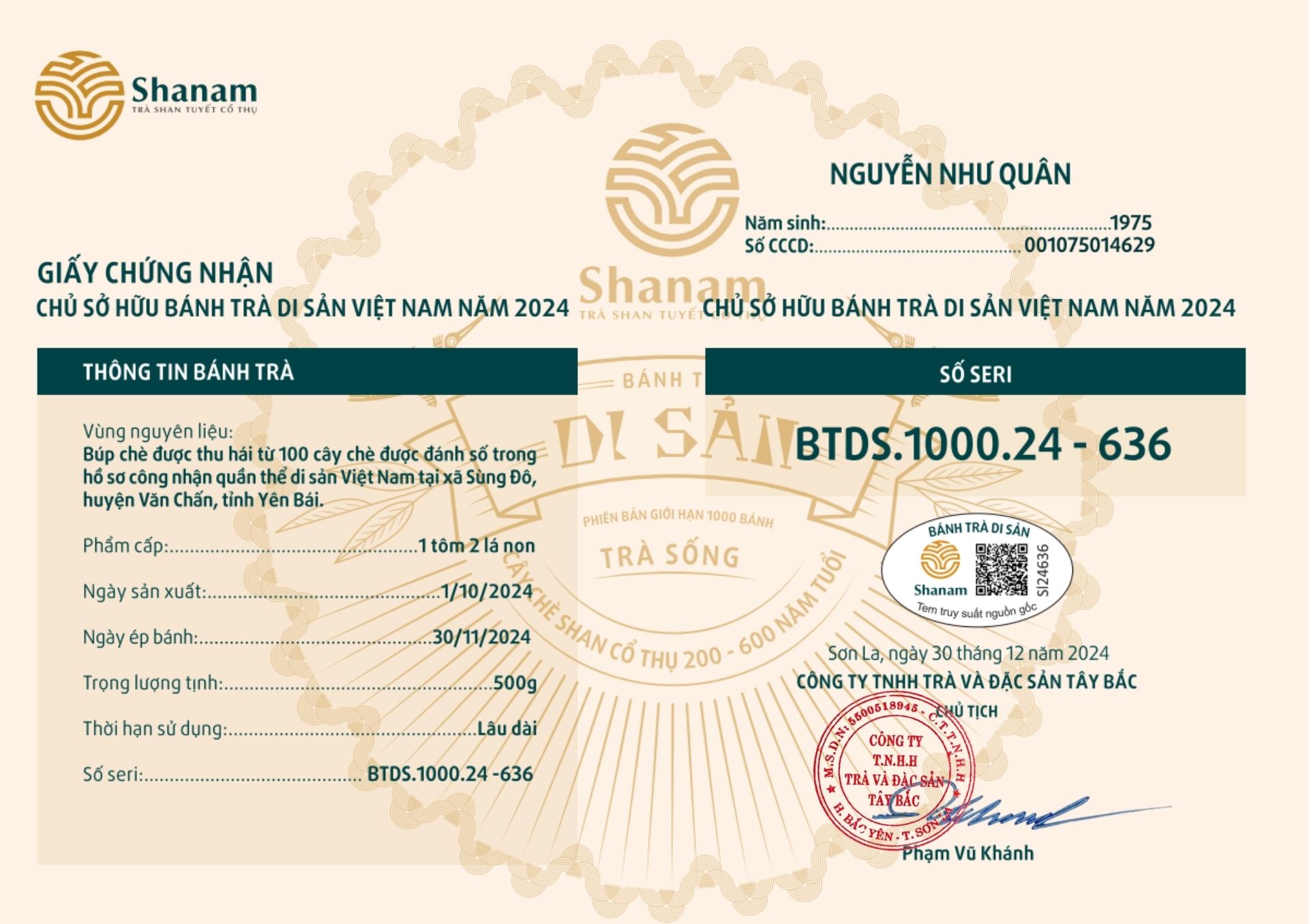 Bánh trà Di sản Việt Nam năm 2023 sản xuất số lượng giới hạn 500 bánh, được đánh mã số từng bánh trà theo thứ tự từ 1 – 500 và có chữ ký trực tiếp của người sáng lập thương hiệu trà Shanam Phạm Vũ Khánh trên từng bánh trà. Mỗi bánh trà có QR riêng truy suất về website www.shanam.com.vn chứng minh chủ sở hữu của bánh trà.