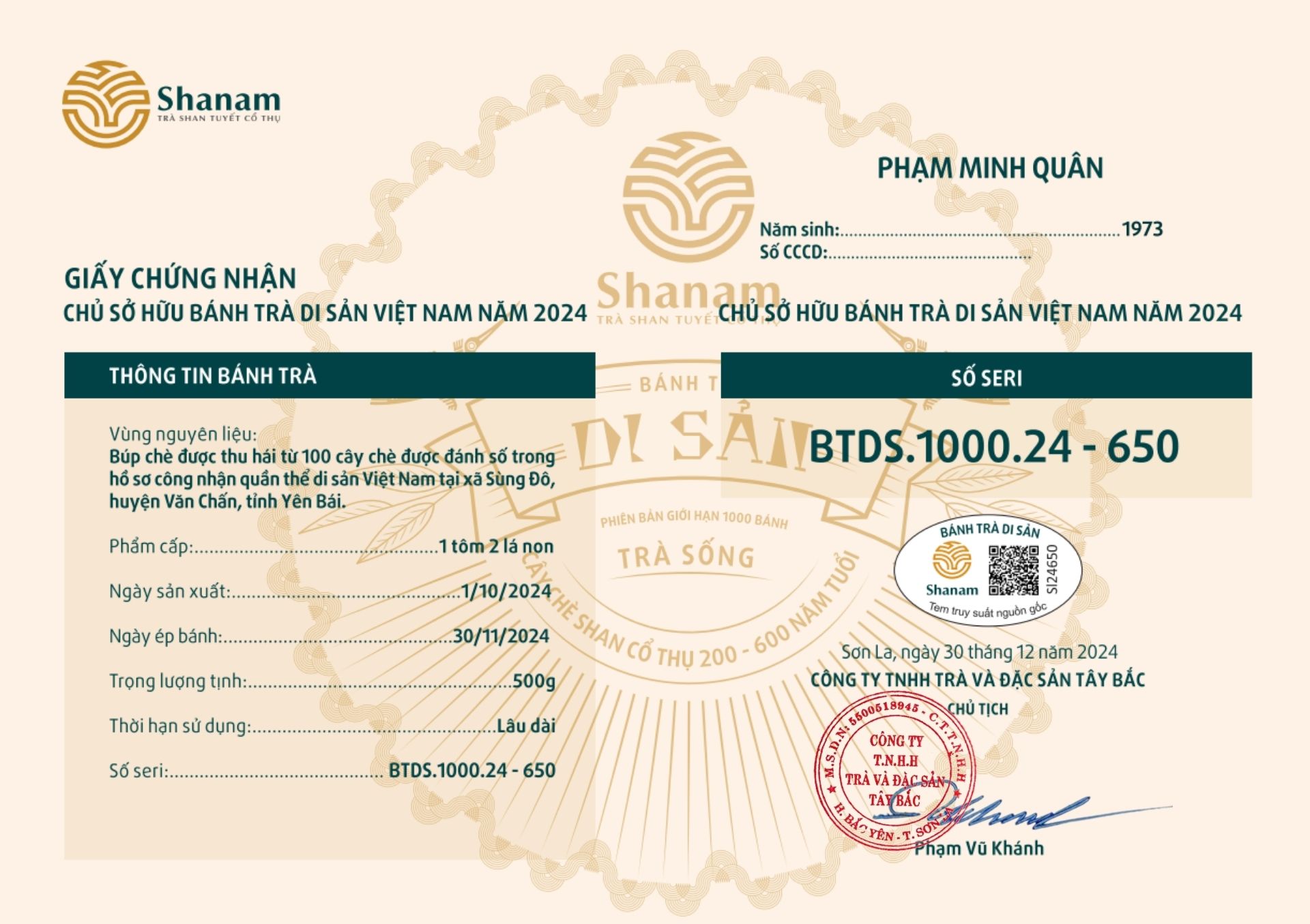 Bánh trà Di sản Việt Nam năm 2023 sản xuất số lượng giới hạn 500 bánh, được đánh mã số từng bánh trà theo thứ tự từ 1 – 500 và có chữ ký trực tiếp của người sáng lập thương hiệu trà Shanam Phạm Vũ Khánh trên từng bánh trà. Mỗi bánh trà có QR riêng truy suất về website www.shanam.com.vn chứng minh chủ sở hữu của bánh trà.