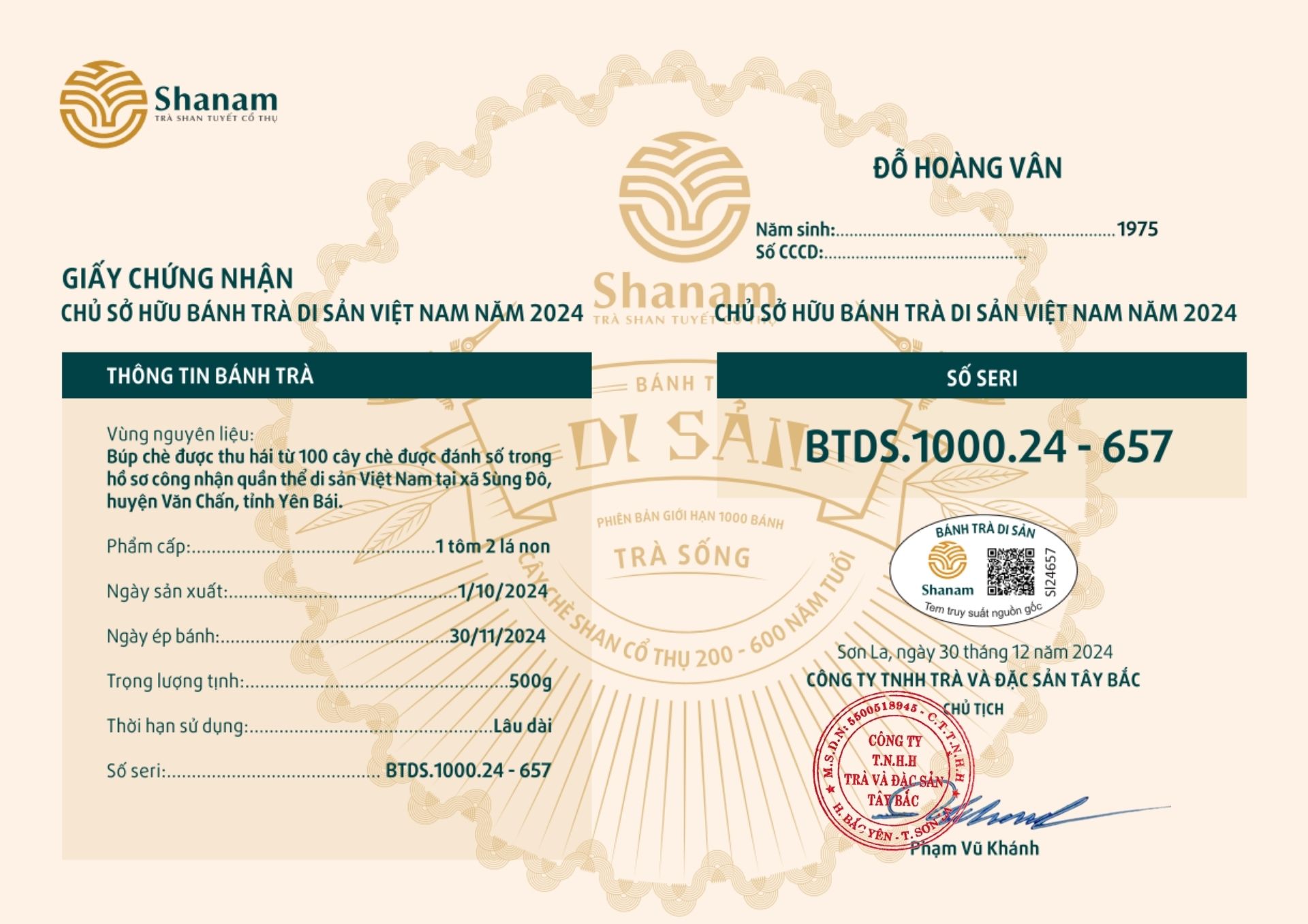 Bánh trà Di sản Việt Nam năm 2023 sản xuất số lượng giới hạn 500 bánh, được đánh mã số từng bánh trà theo thứ tự từ 1 – 500 và có chữ ký trực tiếp của người sáng lập thương hiệu trà Shanam Phạm Vũ Khánh trên từng bánh trà. Mỗi bánh trà có QR riêng truy suất về website www.shanam.com.vn chứng minh chủ sở hữu của bánh trà.