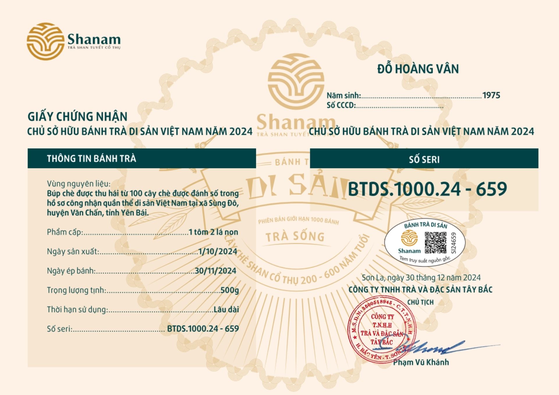 Bánh trà Di sản Việt Nam năm 2023 sản xuất số lượng giới hạn 500 bánh, được đánh mã số từng bánh trà theo thứ tự từ 1 – 500 và có chữ ký trực tiếp của người sáng lập thương hiệu trà Shanam Phạm Vũ Khánh trên từng bánh trà. Mỗi bánh trà có QR riêng truy suất về website www.shanam.com.vn chứng minh chủ sở hữu của bánh trà.