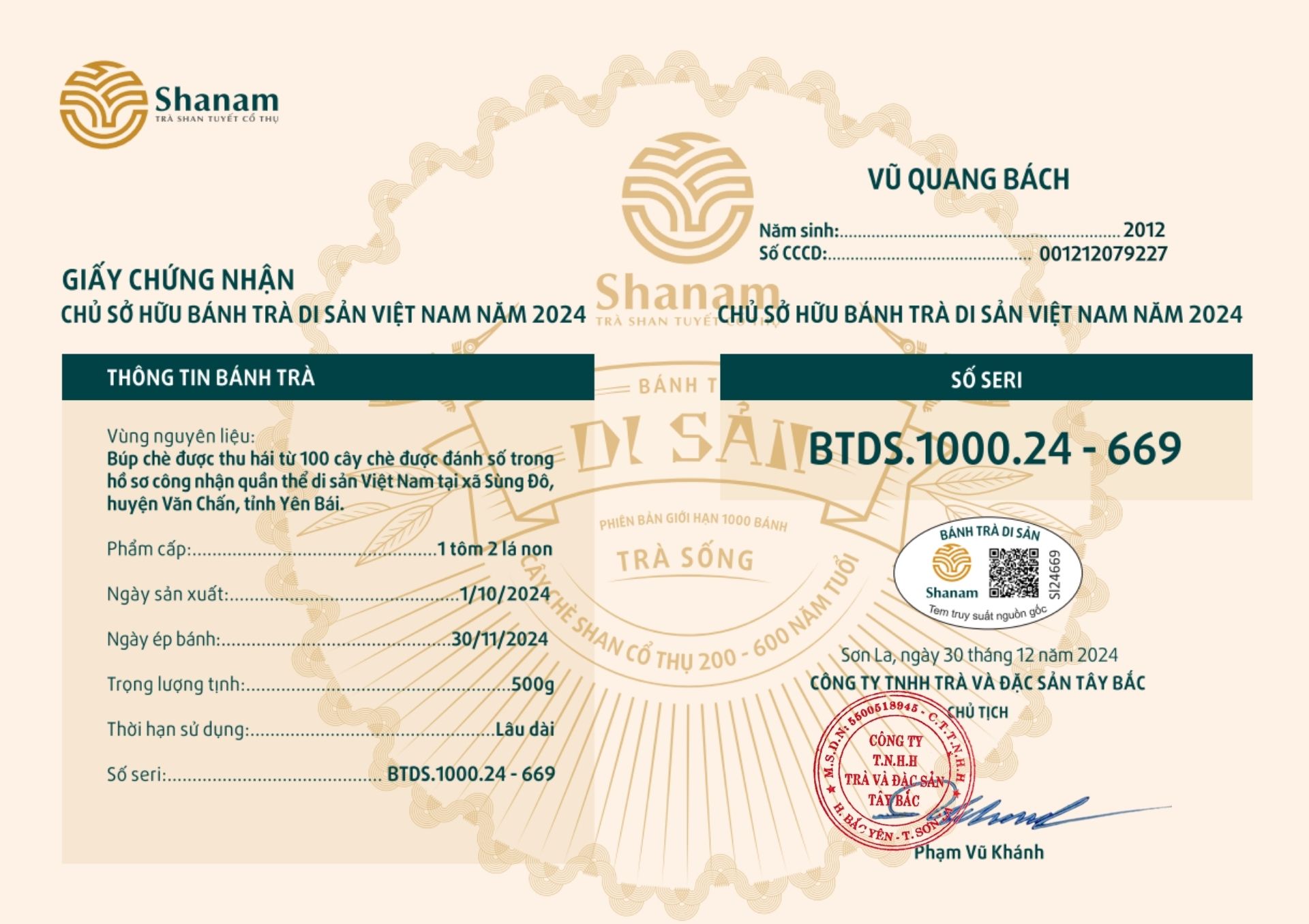 Bánh trà Di sản Việt Nam năm 2023 sản xuất số lượng giới hạn 500 bánh, được đánh mã số từng bánh trà theo thứ tự từ 1 – 500 và có chữ ký trực tiếp của người sáng lập thương hiệu trà Shanam Phạm Vũ Khánh trên từng bánh trà. Mỗi bánh trà có QR riêng truy suất về website www.shanam.com.vn chứng minh chủ sở hữu của bánh trà.