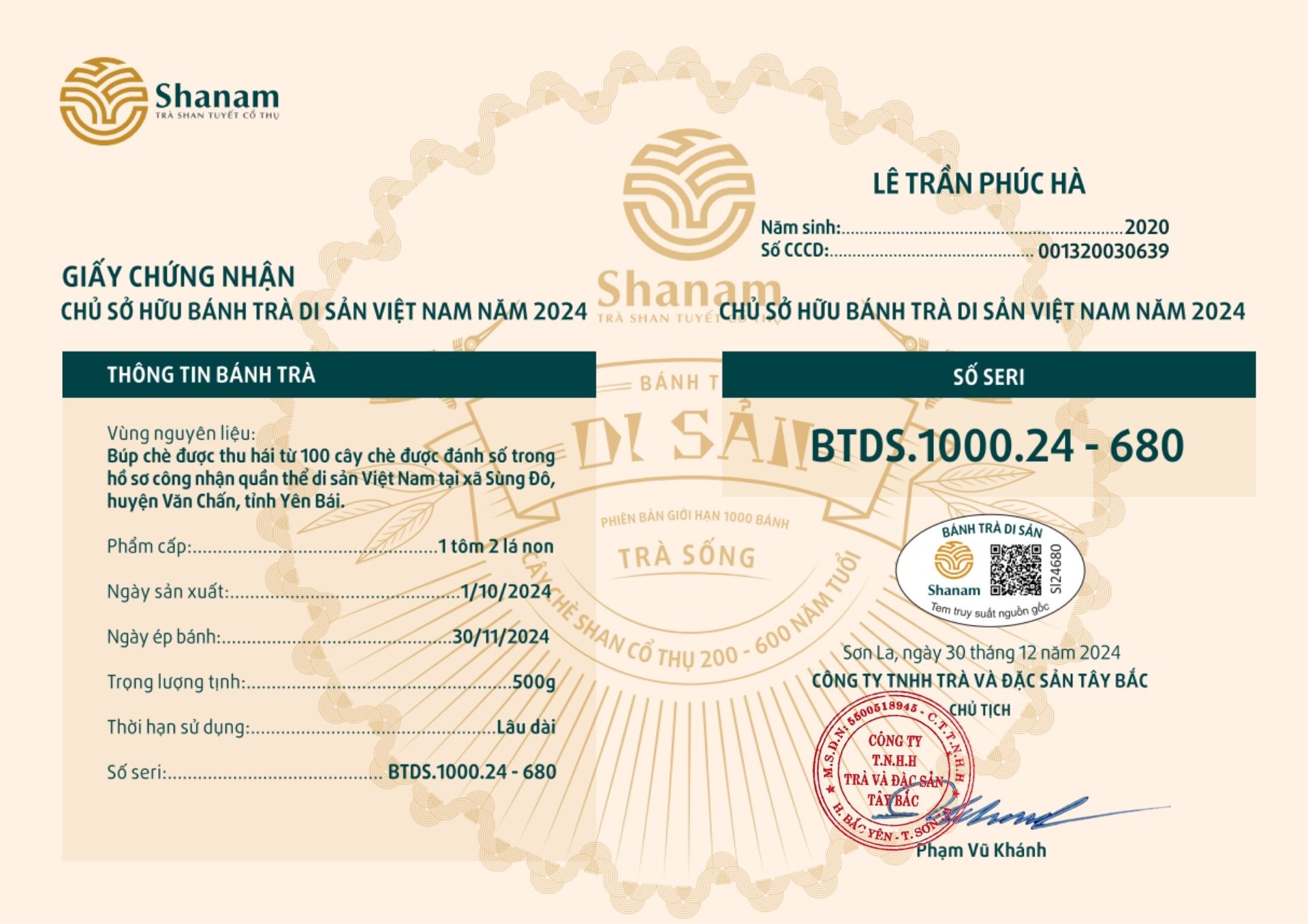 Bánh trà Di sản Việt Nam năm 2023 sản xuất số lượng giới hạn 500 bánh, được đánh mã số từng bánh trà theo thứ tự từ 1 – 500 và có chữ ký trực tiếp của người sáng lập thương hiệu trà Shanam Phạm Vũ Khánh trên từng bánh trà. Mỗi bánh trà có QR riêng truy suất về website www.shanam.com.vn chứng minh chủ sở hữu của bánh trà.