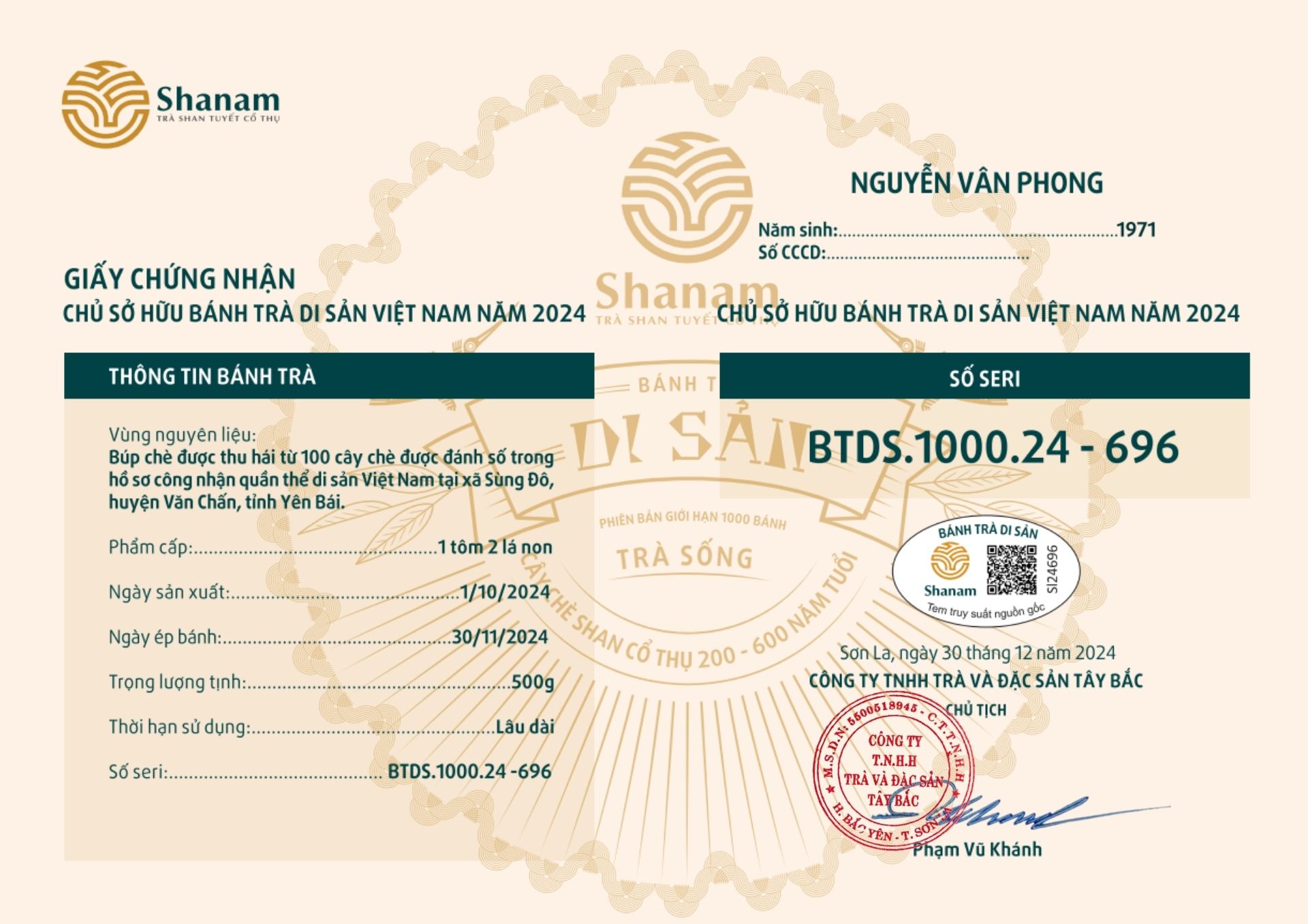 Bánh trà Di sản Việt Nam năm 2023 sản xuất số lượng giới hạn 500 bánh, được đánh mã số từng bánh trà theo thứ tự từ 1 – 500 và có chữ ký trực tiếp của người sáng lập thương hiệu trà Shanam Phạm Vũ Khánh trên từng bánh trà. Mỗi bánh trà có QR riêng truy suất về website www.shanam.com.vn chứng minh chủ sở hữu của bánh trà.