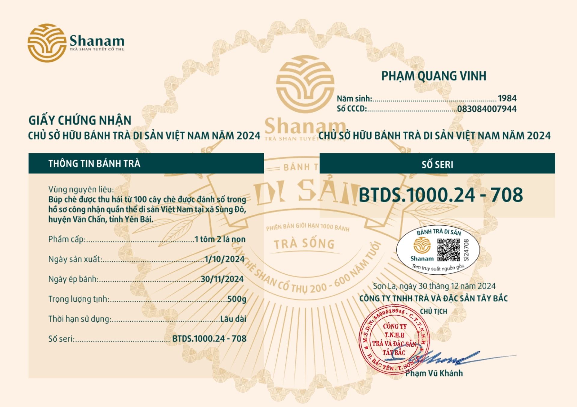Bánh trà Di sản Việt Nam năm 2023 sản xuất số lượng giới hạn 500 bánh, được đánh mã số từng bánh trà theo thứ tự từ 1 – 500 và có chữ ký trực tiếp của người sáng lập thương hiệu trà Shanam Phạm Vũ Khánh trên từng bánh trà. Mỗi bánh trà có QR riêng truy suất về website www.shanam.com.vn chứng minh chủ sở hữu của bánh trà.
