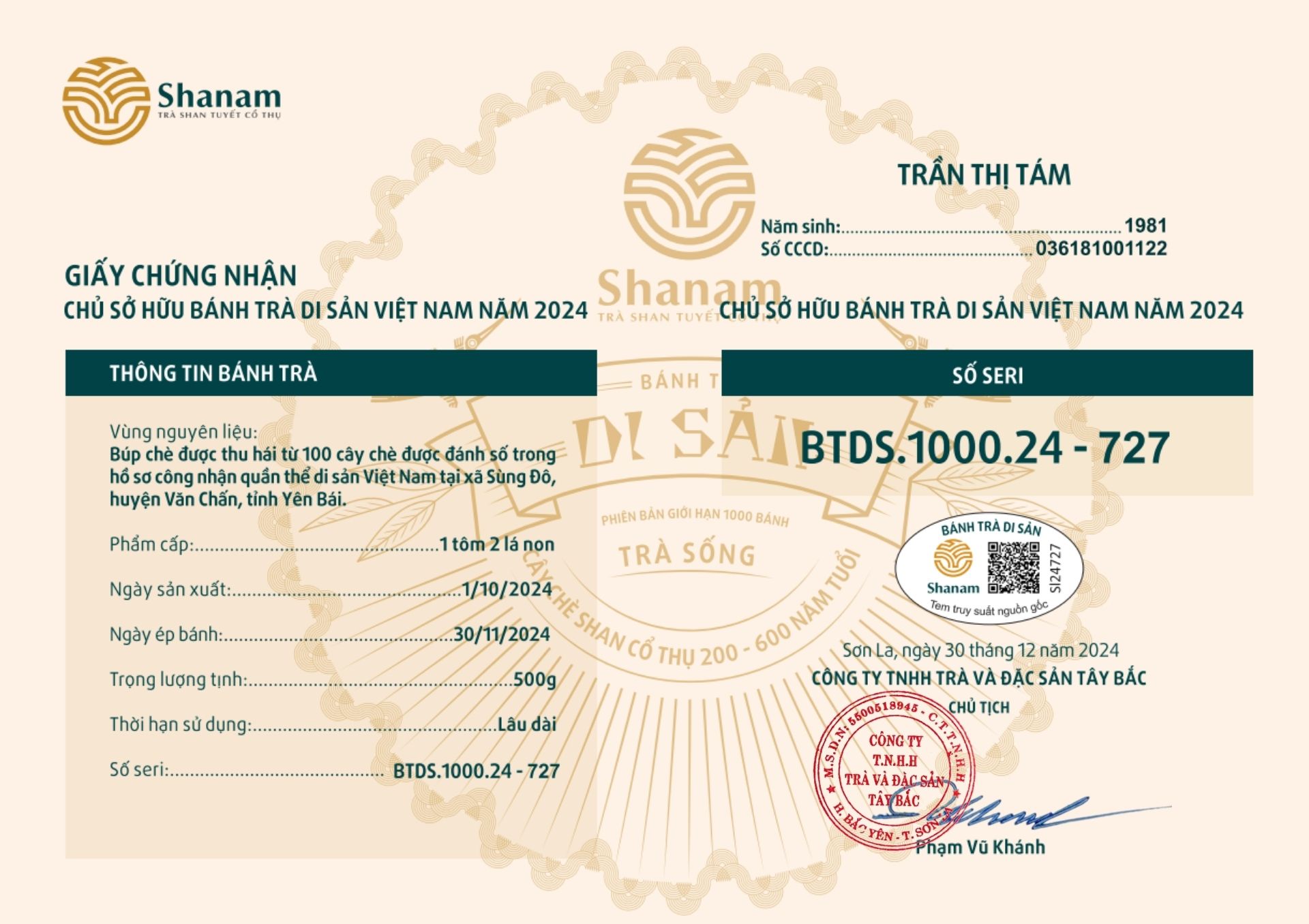 Bánh trà Di sản Việt Nam năm 2023 sản xuất số lượng giới hạn 500 bánh, được đánh mã số từng bánh trà theo thứ tự từ 1 – 500 và có chữ ký trực tiếp của người sáng lập thương hiệu trà Shanam Phạm Vũ Khánh trên từng bánh trà. Mỗi bánh trà có QR riêng truy suất về website www.shanam.com.vn chứng minh chủ sở hữu của bánh trà.