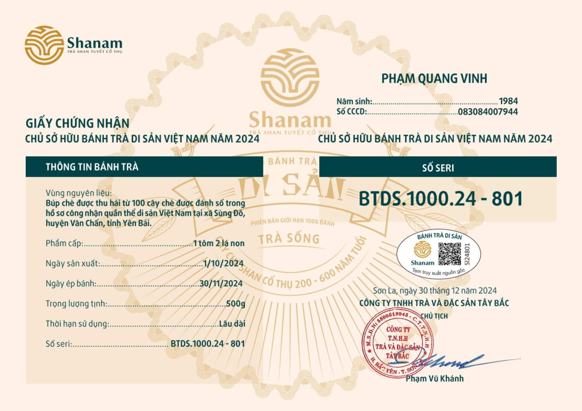 Bánh trà Di sản Việt Nam năm 2023 sản xuất số lượng giới hạn 500 bánh, được đánh mã số từng bánh trà theo thứ tự từ 1 – 500 và có chữ ký trực tiếp của người sáng lập thương hiệu trà Shanam Phạm Vũ Khánh trên từng bánh trà. Mỗi bánh trà có QR riêng truy suất về website www.shanam.com.vn chứng minh chủ sở hữu của bánh trà.