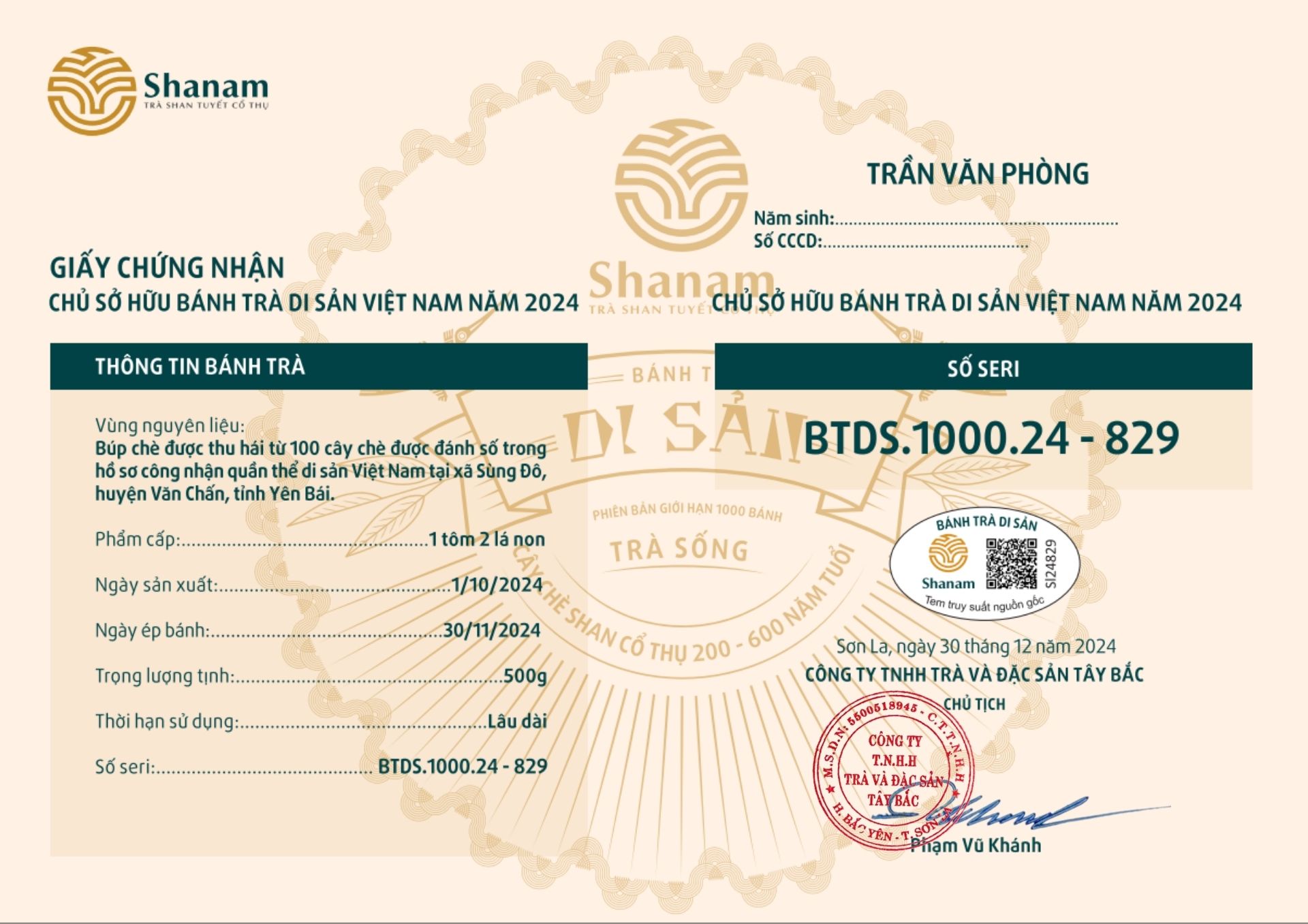 Bánh trà Di sản Việt Nam năm 2023 sản xuất số lượng giới hạn 500 bánh, được đánh mã số từng bánh trà theo thứ tự từ 1 – 500 và có chữ ký trực tiếp của người sáng lập thương hiệu trà Shanam Phạm Vũ Khánh trên từng bánh trà. Mỗi bánh trà có QR riêng truy suất về website www.shanam.com.vn chứng minh chủ sở hữu của bánh trà.