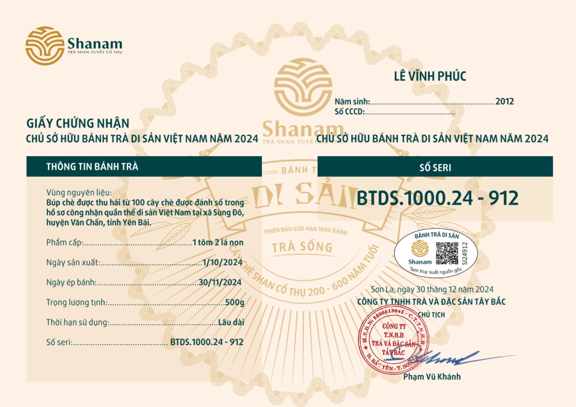 Bánh trà Di sản Việt Nam năm 2023 sản xuất số lượng giới hạn 500 bánh, được đánh mã số từng bánh trà theo thứ tự từ 1 – 500 và có chữ ký trực tiếp của người sáng lập thương hiệu trà Shanam Phạm Vũ Khánh trên từng bánh trà. Mỗi bánh trà có QR riêng truy suất về website www.shanam.com.vn chứng minh chủ sở hữu của bánh trà.