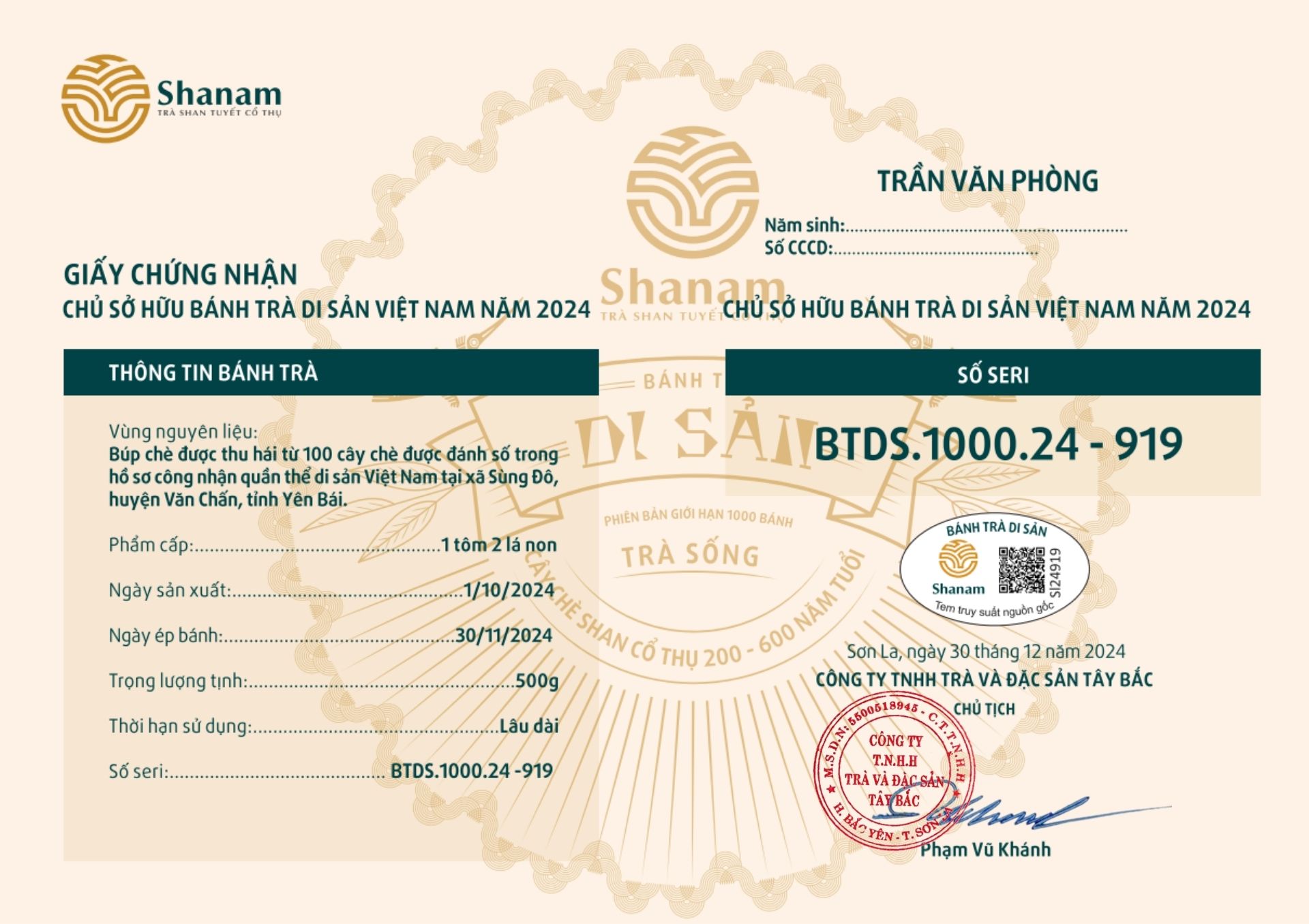 Bánh trà Di sản Việt Nam năm 2023 sản xuất số lượng giới hạn 500 bánh, được đánh mã số từng bánh trà theo thứ tự từ 1 – 500 và có chữ ký trực tiếp của người sáng lập thương hiệu trà Shanam Phạm Vũ Khánh trên từng bánh trà. Mỗi bánh trà có QR riêng truy suất về website www.shanam.com.vn chứng minh chủ sở hữu của bánh trà.