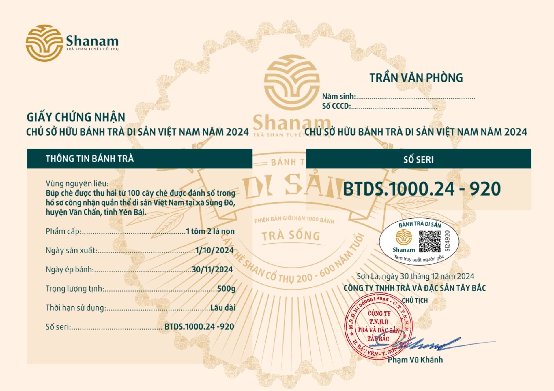 Bánh trà Di sản Việt Nam năm 2023 sản xuất số lượng giới hạn 500 bánh, được đánh mã số từng bánh trà theo thứ tự từ 1 – 500 và có chữ ký trực tiếp của người sáng lập thương hiệu trà Shanam Phạm Vũ Khánh trên từng bánh trà. Mỗi bánh trà có QR riêng truy suất về website www.shanam.com.vn chứng minh chủ sở hữu của bánh trà.