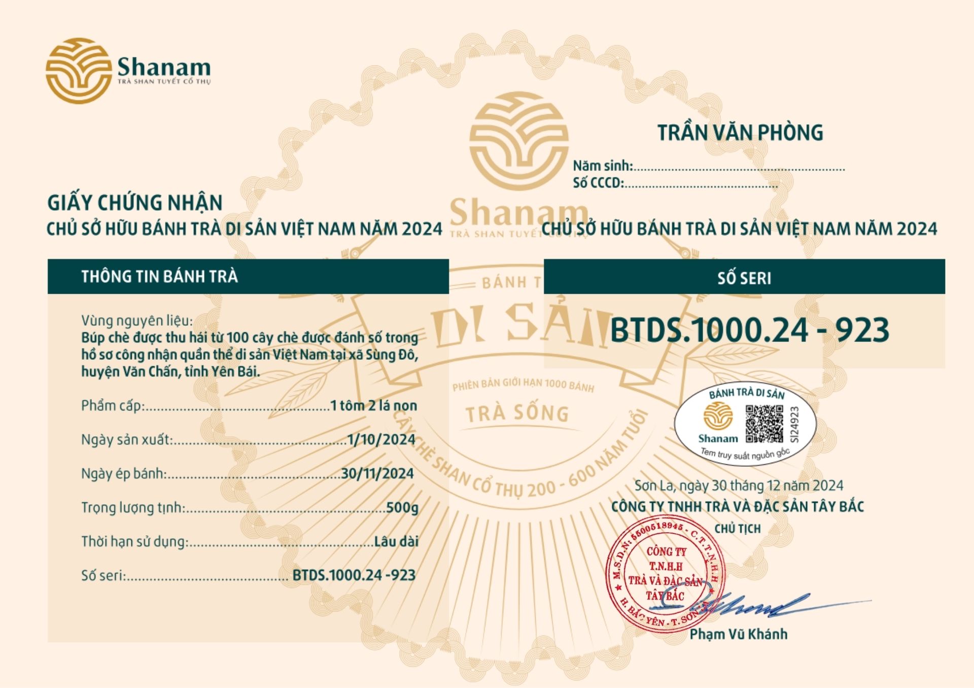 Bánh trà Di sản Việt Nam năm 2023 sản xuất số lượng giới hạn 500 bánh, được đánh mã số từng bánh trà theo thứ tự từ 1 – 500 và có chữ ký trực tiếp của người sáng lập thương hiệu trà Shanam Phạm Vũ Khánh trên từng bánh trà. Mỗi bánh trà có QR riêng truy suất về website www.shanam.com.vn chứng minh chủ sở hữu của bánh trà.