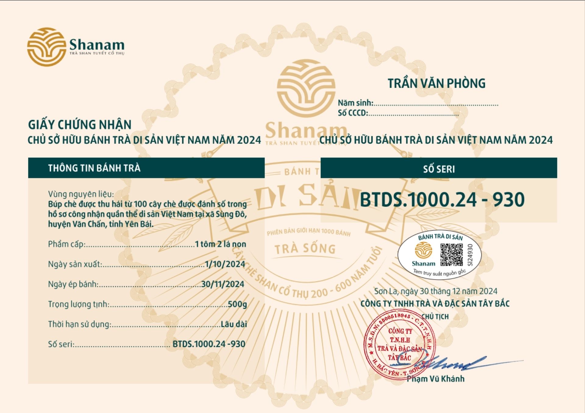 Bánh trà Di sản Việt Nam năm 2023 sản xuất số lượng giới hạn 500 bánh, được đánh mã số từng bánh trà theo thứ tự từ 1 – 500 và có chữ ký trực tiếp của người sáng lập thương hiệu trà Shanam Phạm Vũ Khánh trên từng bánh trà. Mỗi bánh trà có QR riêng truy suất về website www.shanam.com.vn chứng minh chủ sở hữu của bánh trà.