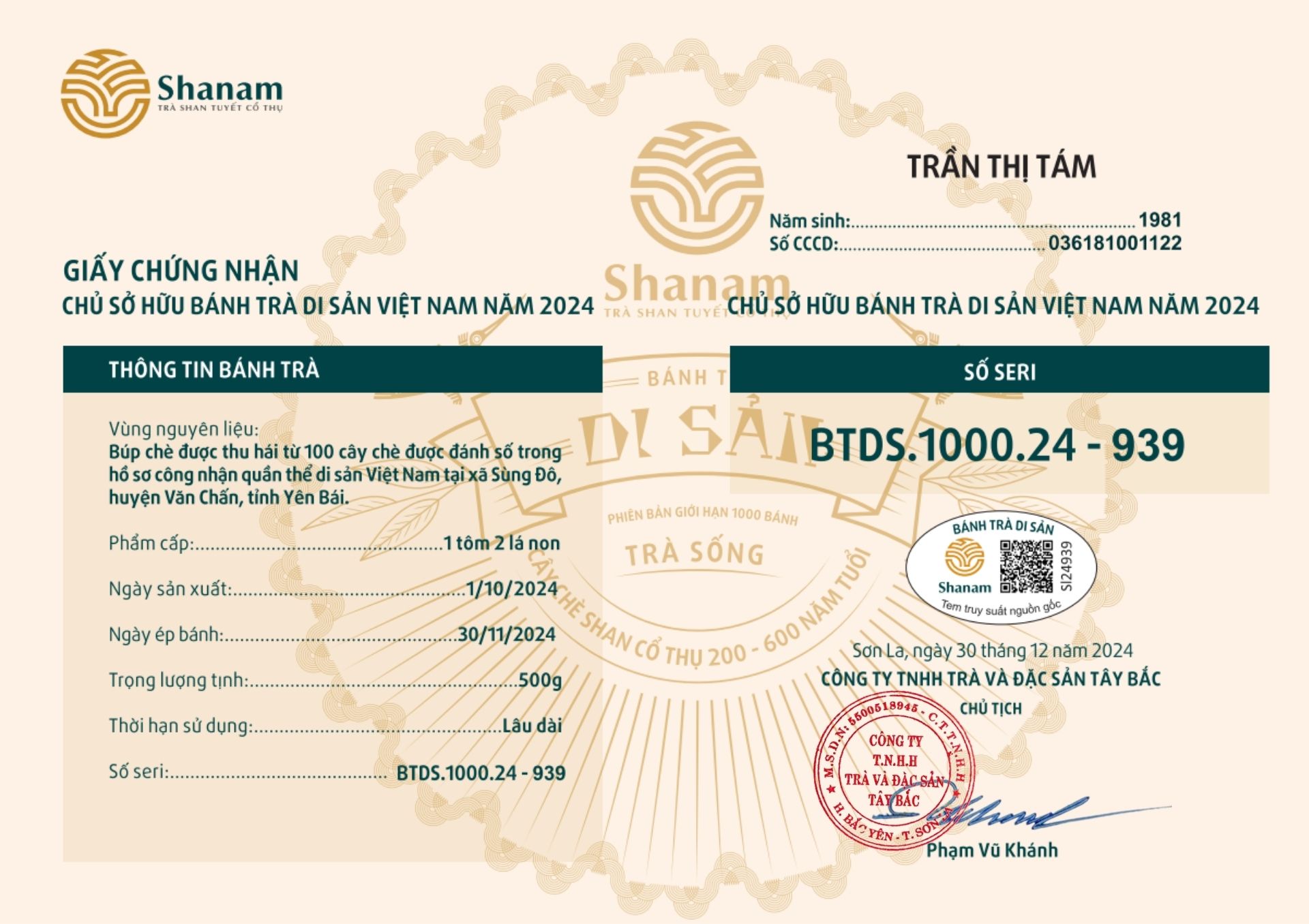 Bánh trà Di sản Việt Nam năm 2023 sản xuất số lượng giới hạn 500 bánh, được đánh mã số từng bánh trà theo thứ tự từ 1 – 500 và có chữ ký trực tiếp của người sáng lập thương hiệu trà Shanam Phạm Vũ Khánh trên từng bánh trà. Mỗi bánh trà có QR riêng truy suất về website www.shanam.com.vn chứng minh chủ sở hữu của bánh trà.