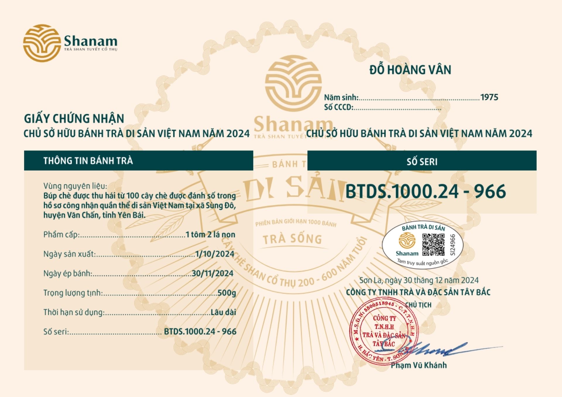 Bánh trà Di sản Việt Nam năm 2023 sản xuất số lượng giới hạn 500 bánh, được đánh mã số từng bánh trà theo thứ tự từ 1 – 500 và có chữ ký trực tiếp của người sáng lập thương hiệu trà Shanam Phạm Vũ Khánh trên từng bánh trà. Mỗi bánh trà có QR riêng truy suất về website www.shanam.com.vn chứng minh chủ sở hữu của bánh trà.