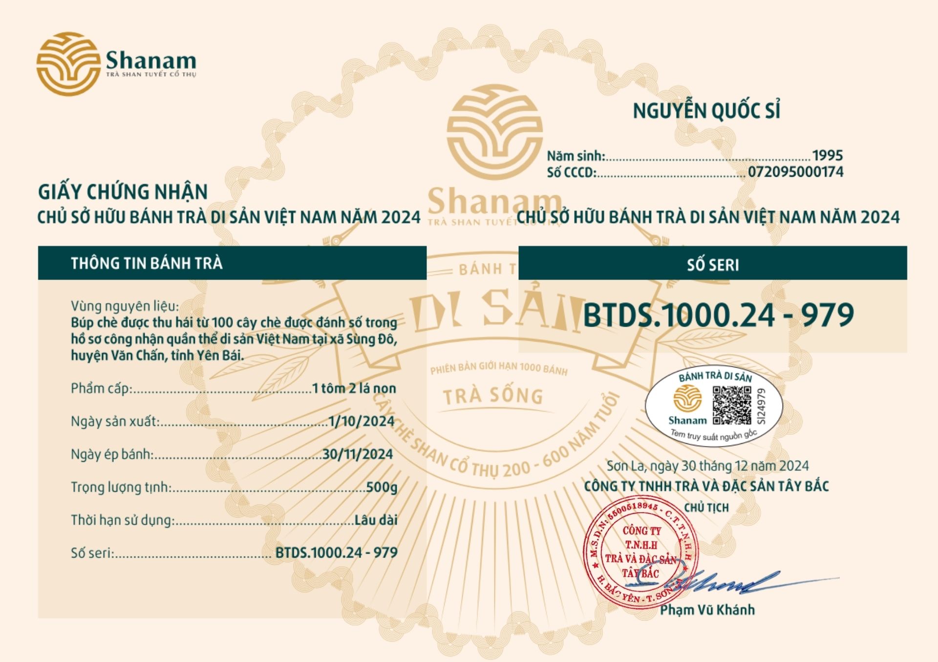 Bánh trà Di sản Việt Nam năm 2023 sản xuất số lượng giới hạn 500 bánh, được đánh mã số từng bánh trà theo thứ tự từ 1 – 500 và có chữ ký trực tiếp của người sáng lập thương hiệu trà Shanam Phạm Vũ Khánh trên từng bánh trà. Mỗi bánh trà có QR riêng truy suất về website www.shanam.com.vn chứng minh chủ sở hữu của bánh trà.