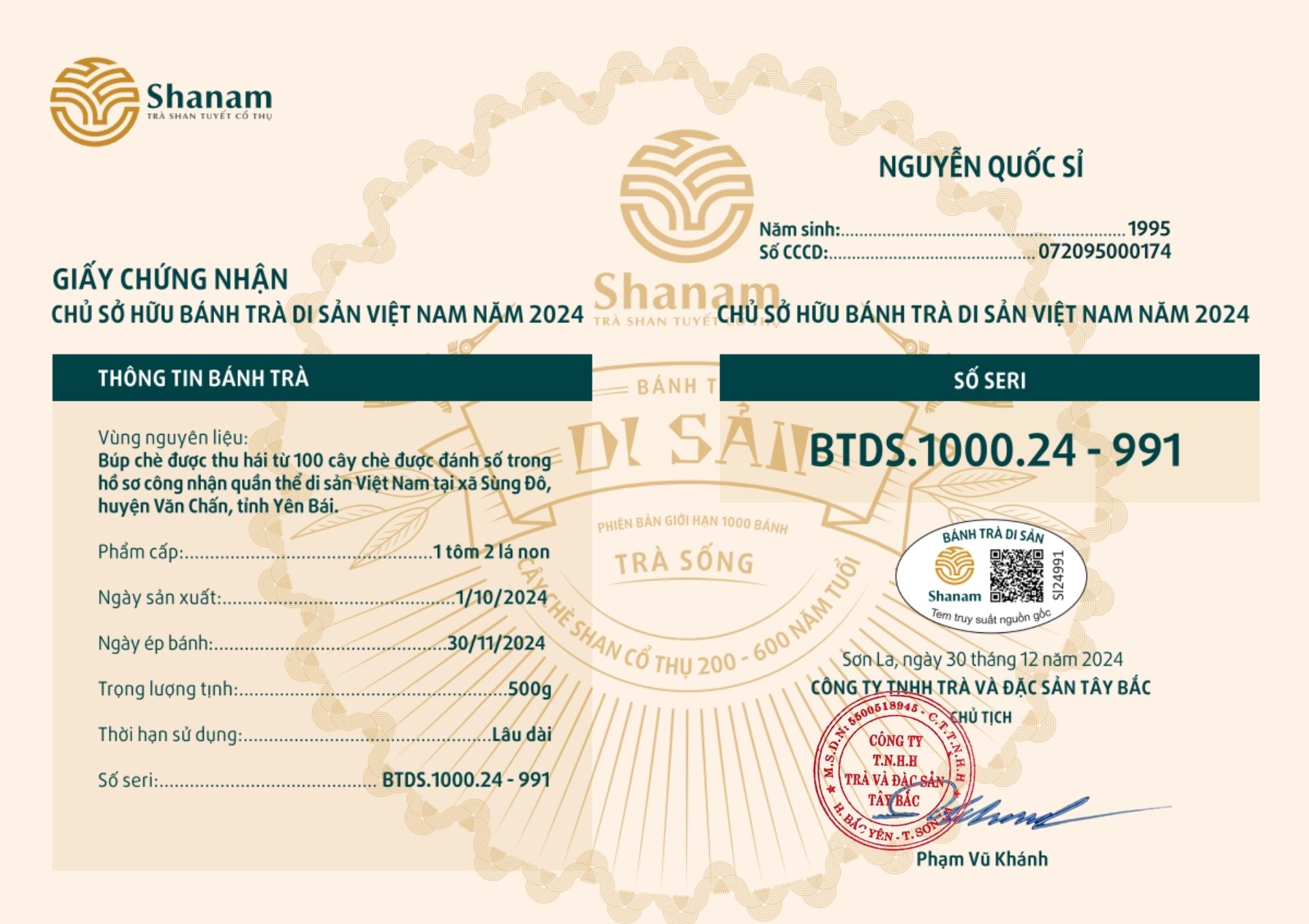 Bánh trà Di sản Việt Nam năm 2023 sản xuất số lượng giới hạn 500 bánh, được đánh mã số từng bánh trà theo thứ tự từ 1 – 500 và có chữ ký trực tiếp của người sáng lập thương hiệu trà Shanam Phạm Vũ Khánh trên từng bánh trà. Mỗi bánh trà có QR riêng truy suất về website www.shanam.com.vn chứng minh chủ sở hữu của bánh trà.
