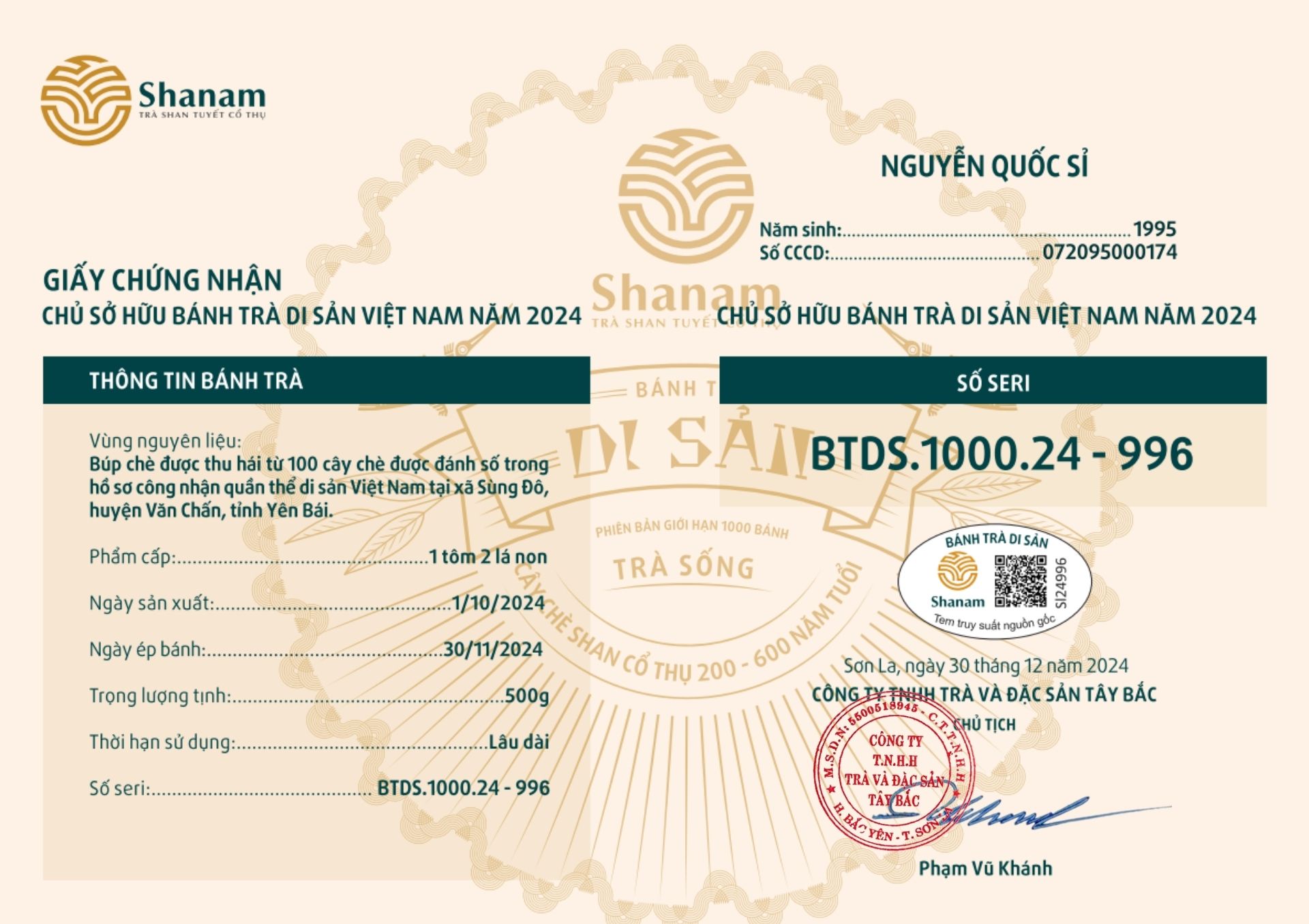 Bánh trà Di sản Việt Nam năm 2023 sản xuất số lượng giới hạn 500 bánh, được đánh mã số từng bánh trà theo thứ tự từ 1 – 500 và có chữ ký trực tiếp của người sáng lập thương hiệu trà Shanam Phạm Vũ Khánh trên từng bánh trà. Mỗi bánh trà có QR riêng truy suất về website www.shanam.com.vn chứng minh chủ sở hữu của bánh trà.