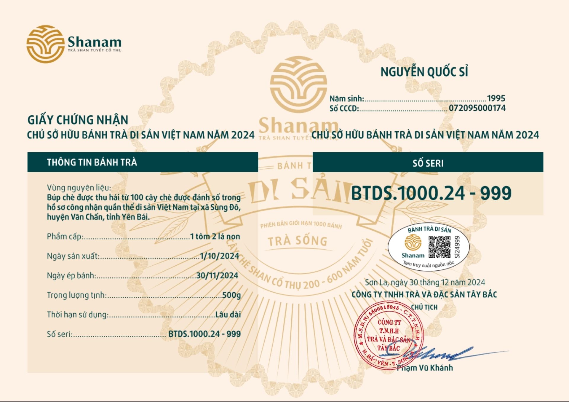 Bánh trà Di sản Việt Nam năm 2023 sản xuất số lượng giới hạn 500 bánh, được đánh mã số từng bánh trà theo thứ tự từ 1 – 500 và có chữ ký trực tiếp của người sáng lập thương hiệu trà Shanam Phạm Vũ Khánh trên từng bánh trà. Mỗi bánh trà có QR riêng truy suất về website www.shanam.com.vn chứng minh chủ sở hữu của bánh trà.
