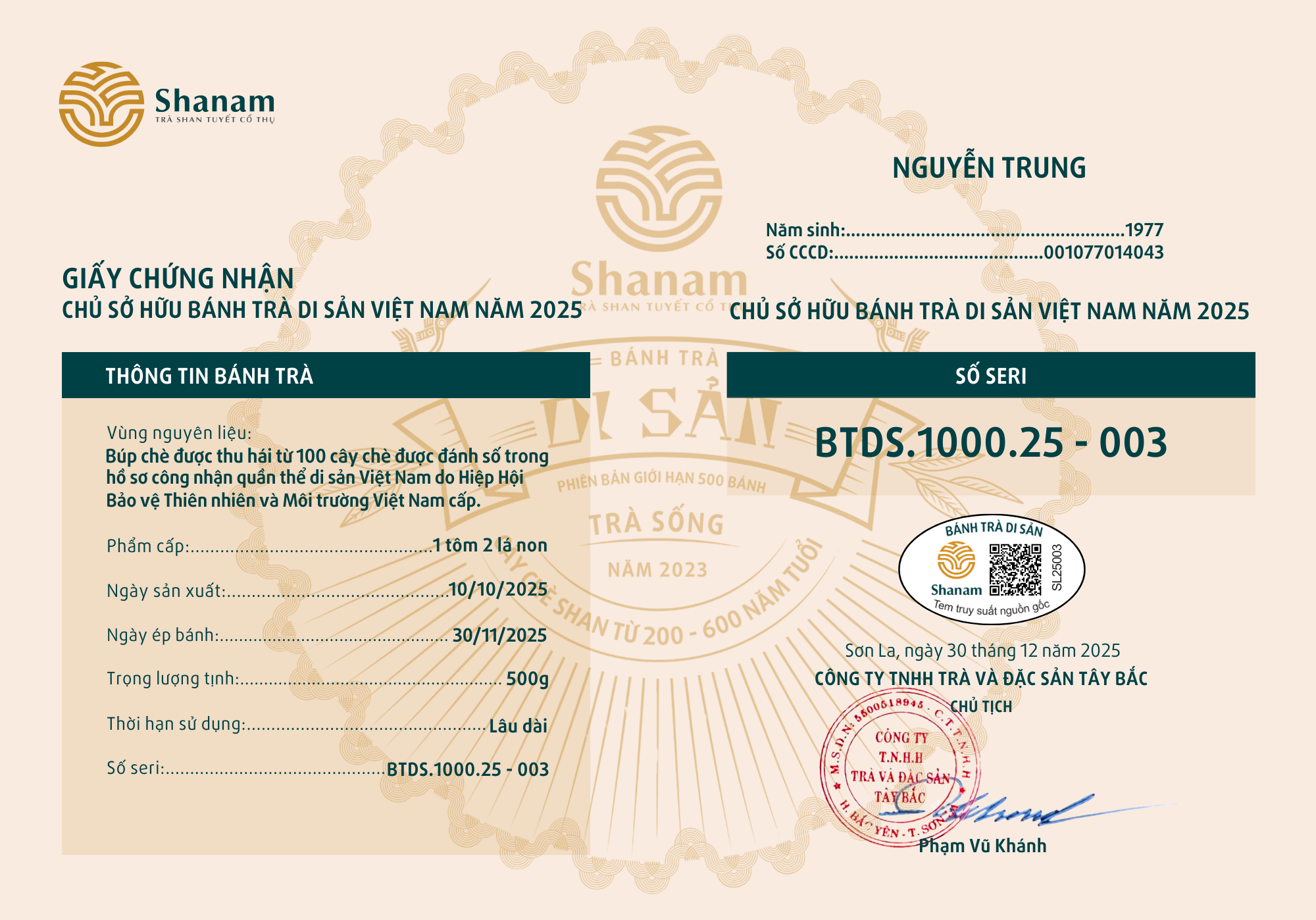 Bánh trà Di sản Việt Nam năm 2023 sản xuất số lượng giới hạn 500 bánh, được đánh mã số từng bánh trà theo thứ tự từ 1 – 500 và có chữ ký trực tiếp của người sáng lập thương hiệu trà Shanam Phạm Vũ Khánh trên từng bánh trà. Mỗi bánh trà có QR riêng truy suất về website www.shanam.com.vn chứng minh chủ sở hữu của bánh trà.
