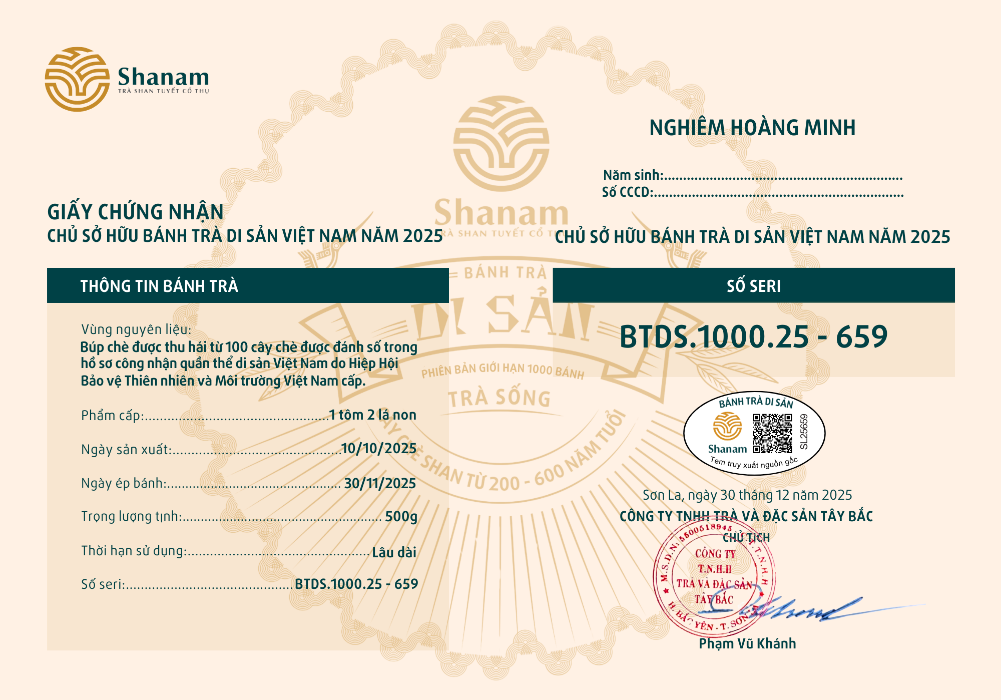 Bánh trà Di sản Việt Nam năm 2023 sản xuất số lượng giới hạn 500 bánh, được đánh mã số từng bánh trà theo thứ tự từ 1 – 500 và có chữ ký trực tiếp của người sáng lập thương hiệu trà Shanam Phạm Vũ Khánh trên từng bánh trà. Mỗi bánh trà có QR riêng truy suất về website www.shanam.com.vn chứng minh chủ sở hữu của bánh trà.