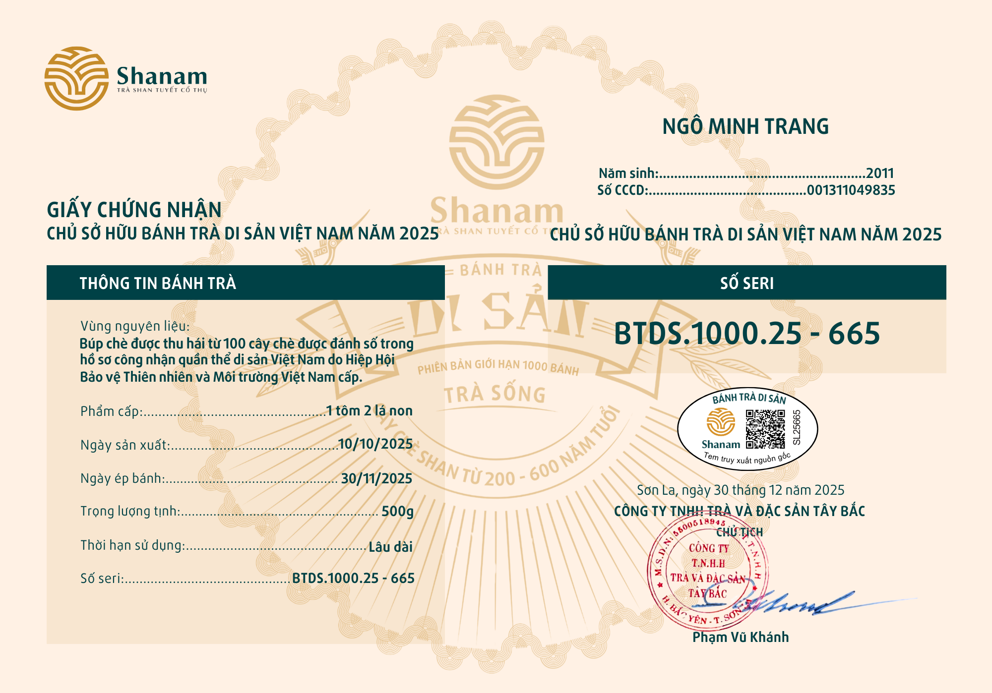 Bánh trà Di sản Việt Nam năm 2023 sản xuất số lượng giới hạn 500 bánh, được đánh mã số từng bánh trà theo thứ tự từ 1 – 500 và có chữ ký trực tiếp của người sáng lập thương hiệu trà Shanam Phạm Vũ Khánh trên từng bánh trà. Mỗi bánh trà có QR riêng truy suất về website www.shanam.com.vn chứng minh chủ sở hữu của bánh trà.
