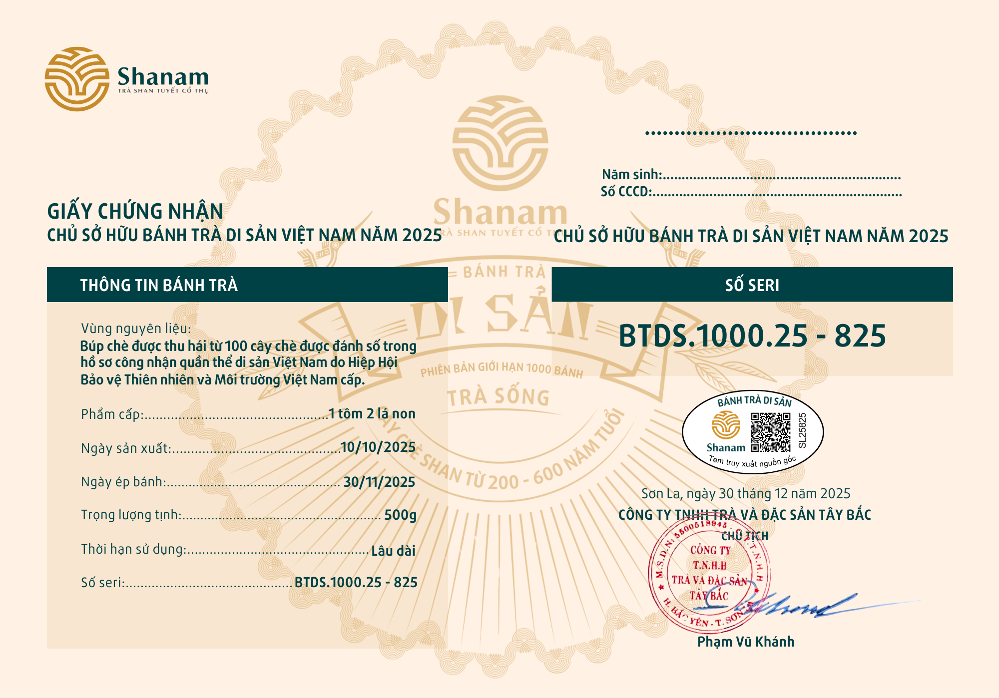 Bánh trà Di sản Việt Nam năm 2023 sản xuất số lượng giới hạn 500 bánh, được đánh mã số từng bánh trà theo thứ tự từ 1 – 500 và có chữ ký trực tiếp của người sáng lập thương hiệu trà Shanam Phạm Vũ Khánh trên từng bánh trà. Mỗi bánh trà có QR riêng truy suất về website www.shanam.com.vn chứng minh chủ sở hữu của bánh trà.