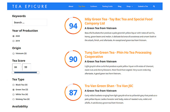 | Tea Epicture: Là một tổ chức độc lập của Mỹ giới thiệu cho người tiêu dùng và yêu trà các nhà sản xuất trà uy tín của thế giới bằng cách đánh giá chất lượng khách quan các loại trà với thang điểm từ 50-100 điểm. |