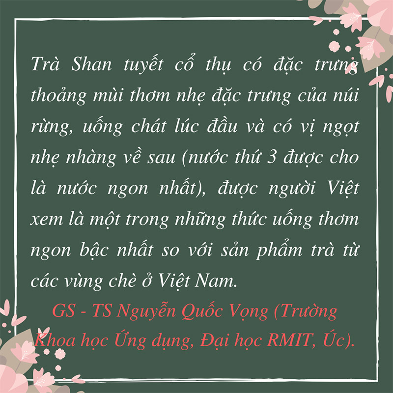 Hậu vị của phẩm trà Shanam, dịu ngọt, sâu lắng, từ từ đi vào tâm thức người uống, đánh thức mọi giác quan, sự tỉnh táo không phải do chất tannin hay caffein trong trà đem lại, mà ở hương của trà, mùi vị của rừng núi, của mây ngàn, gió thoảng, của những khoảng thời gian có thể thư thái và đẹp đẽ nhất, tựa như bạn đi xuyên qua khu rừng của mùa xuân hay trong một chiều thu tĩnh lặng và thuần khiết.