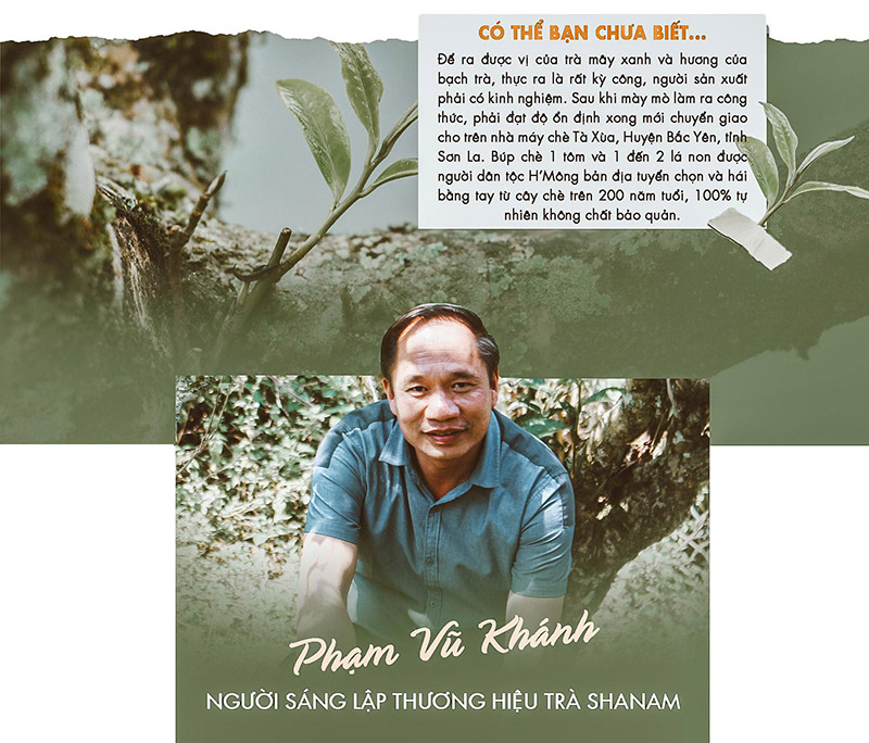 “Để ra được vị của trà mây xanh và hương của bạch trà, thực ra là rất kỳ công, người sản xuất phải có kinh nghiệm. Sau khi mày mò làm ra công thức, phải đạt độ ổn định xong tôi mới chuyển giao cho trên nhà máy chè Tà Xùa, Huyện Bắc Yên, tỉnh Sơn La. Búp chè 1 tôm và 1 đến 2 lá non được người dân tộc H’Mông bản địa tuyển chọn và hái bằng tay từ cây chè trên 200 năm tuổi, 100% tự nhiên không chất bảo quản.”, Phạm Vũ Khánh tự hào kể.